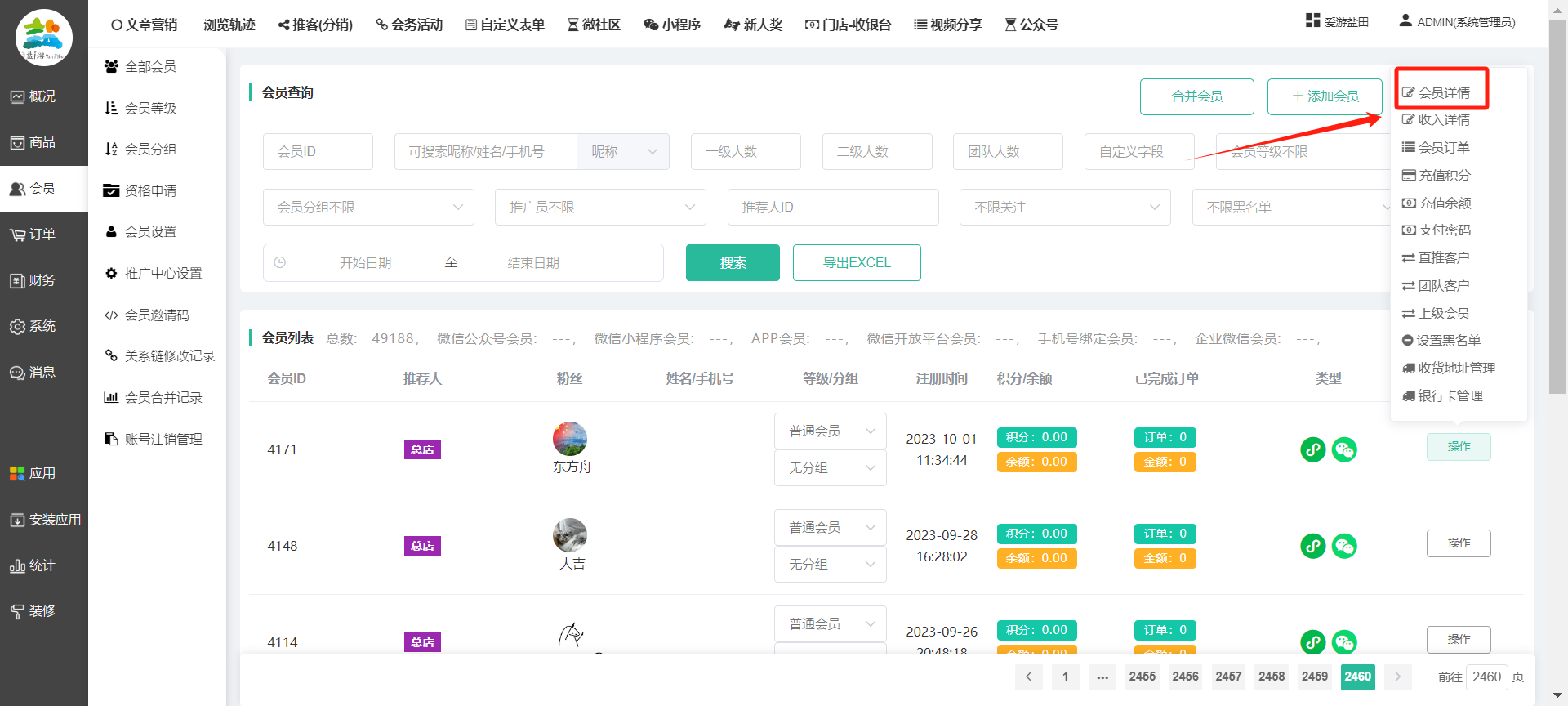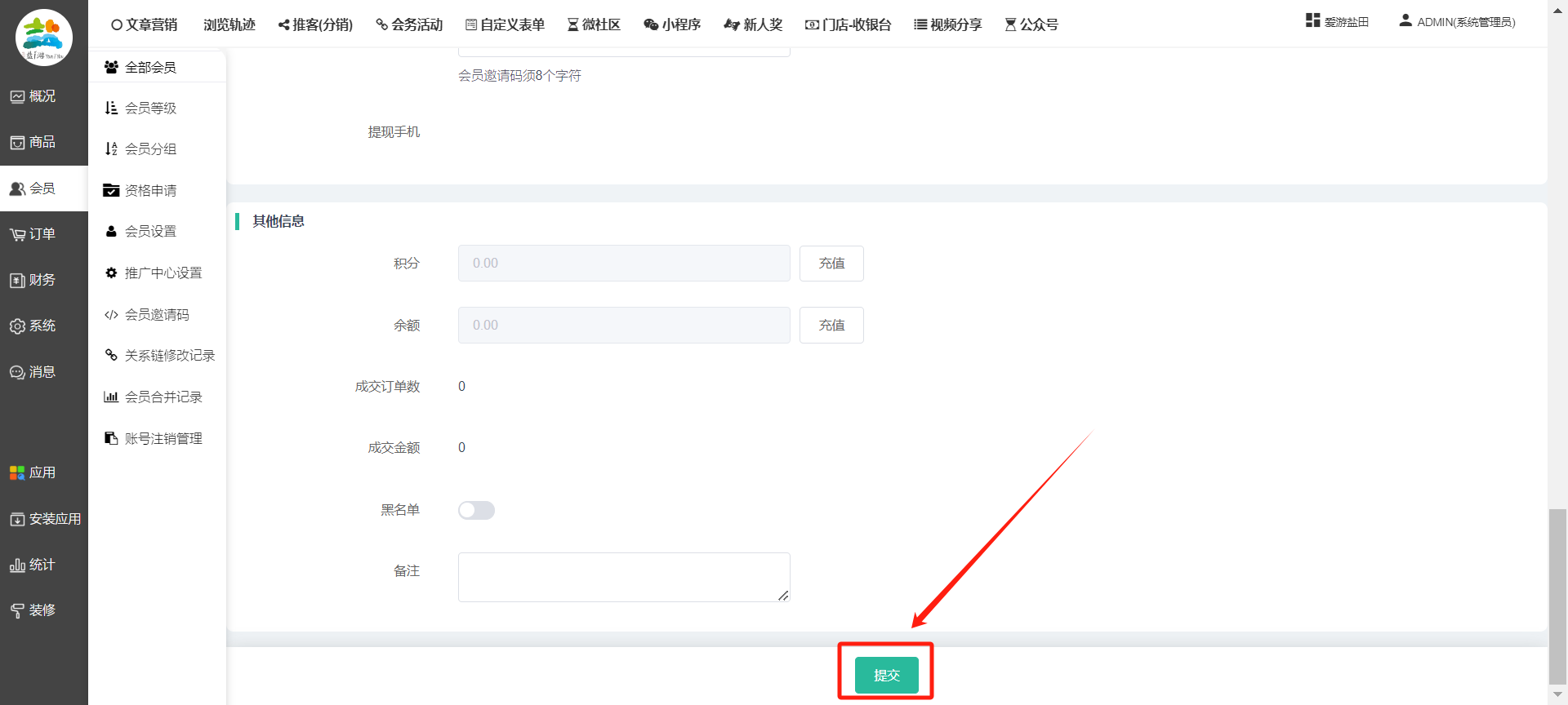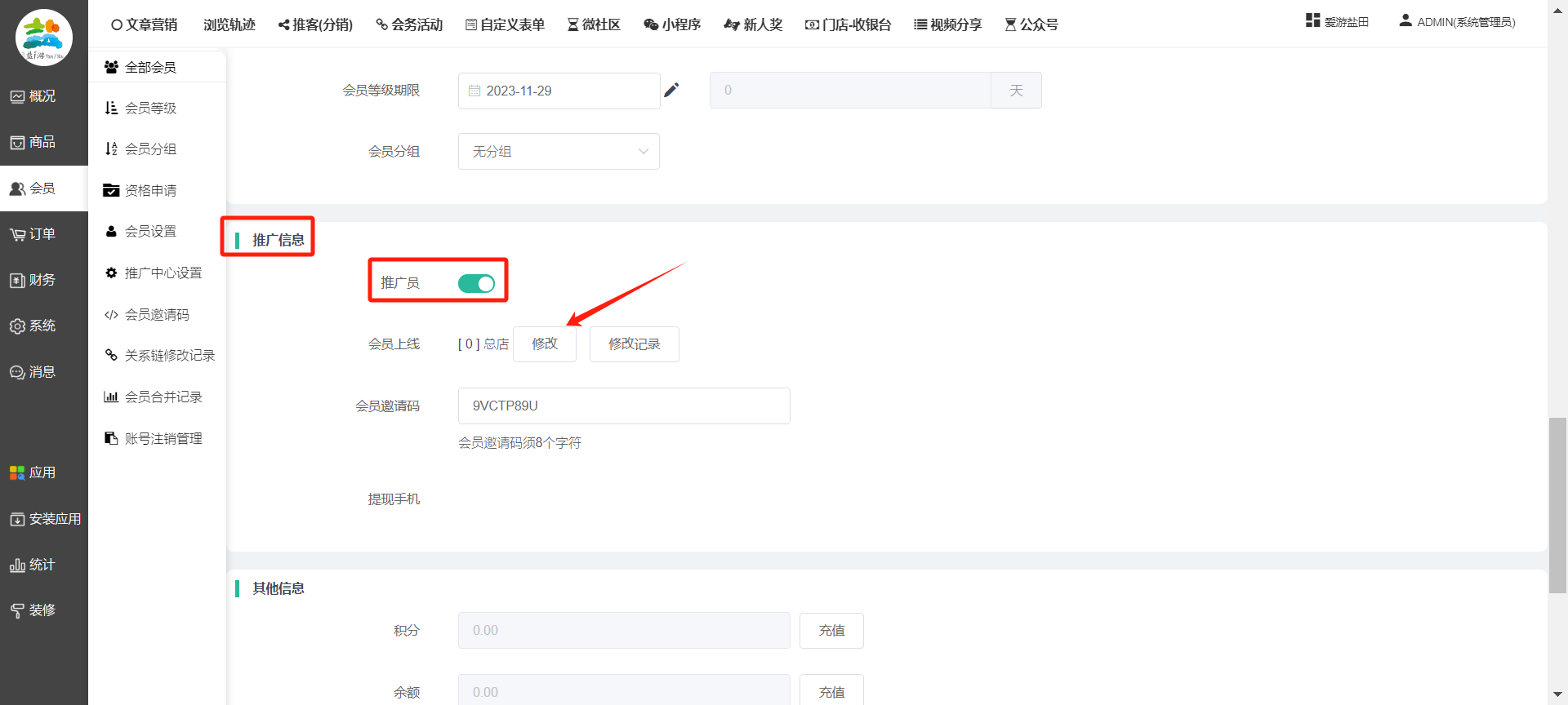 目录 搜索 展开 一、前期准备资料二、数字乡村码-上线操作指南1、服务号的申请流程及认证2、申请小程序流程3、开放平台绑定小程序和公众号三、数字乡村码-系统操作数字乡村码系统管理-概况数字乡村码-商品管理1、发布商品2、商品列表3、商品表单4、商品分类5、品牌管理6、配送模板7、评论管理8、优惠券管理9、商品标签10、退货地址设置11、满额优惠12、批量操作13、配送方式14、基础设置15、商品隐藏四、数字乡村码-会员管理1、全部会员2、会员等级3、会员分组4、资格申请5、会员设置6、推广中心设置7、会员邀请码8、会员关系链修改关系链修改记录9、会员合并记录10、账号注销管理11、会员设置中心五、数字乡村码-订单管理1、订单管理列表2、订单处理流程3、订单状态4、订单修改价格5、订单退款退货6、多包裹发货7、批量发货订单操作步骤8、催发货订单9、物流查询六、数字乡村码-财务管理1、余额设置2、会员余额3、充值记录4、转让记录5、余额明细6、收入明细7、提现设置8、提现统计9、积分管理10、转账审核11、收益广告12、批量充值七、数字乡村码-系统管理1、商城入口2、商城设置①、商城设置②、订单设置③、物流查询④、短信⑤、联系方式⑥、分类⑦、优惠券⑧、分享⑨、幻灯片⑩、广告位⑫、地图设置3、交易设置4、微信模板消息自定义消息模板(新版)自定义消息模板(旧版)小程序消息模板公众号模板消息变更公告5、语言设置6、权限管理7、多媒体管理八、数字乡村码-消息管理九、数字乡村码-应用管理十、数字乡村码系统-数据统计十一、数字乡村码-页面装修DIY1、模板管理2、店铺页面3、顶部导航4、底部导航5、DIY模板市场6、首屏广告7、基础设置8、装修DIY尺寸建议十二、供应商功能插件操作指南1、供应商2、门店-收银台门店申请和使用步骤门店管理①、门店-收银台 营销设置②、门店-收银台 分润设置门店分类门店申请门店审核门店商品门店商品订单收银台订单数据统计核销员基础设置默认设置门店装修3、微社区4、会务活动十三、营销插件操作指南活动报名提货卡新人奖微店问卷调查积分视频分享1、视频分享基础设置2、视频分享发现管理3、视频分享分类管理4、视频分享评论管理5、视频分享分红记录6、视频分享短视频中心每日红包幸运大抽奖签到优惠券二维码任务奖励优惠劵文章音频文章付费文章限时购新海报拓客卡操作流程积分活动素材中心视频红包十四、入驻门店应用类1、门店预约2、附近商品3、门店定位设置4、门店控制5、门店满额包邮6、门店满额减7、导入商品8、门店搜索9、门店股东10、核销券11、多门店核销1、商城后台设置2、前端功能演示十五、常见问题1、后台登录密码修改流程2、会员-余额,积分,后台如何进行充值与扣除3、如何修改上下级关系4、一种万能的获取商城小程序路径的方法 暂无相关搜索结果! 阅读次数:1716 本文档使用 模王系统 发布 8、会员关系链修改 8、会员关系链修改一.如何修改上下级关系?1.会员-全部会员-可以通过搜索用户的独立ID,或者用户微信昵称,找到此会员,然后点击右边的(操作)2.再点击会员详情。3.滑到下面,有个推广信息-会员上线,点击修改4.输入上级的ID号,点击搜索,出来此上级会员后点击选择。5.滑到最下面,一定要点击提交按钮。文档更新时间: 2023-11-30 14:56 作者:链上旅行