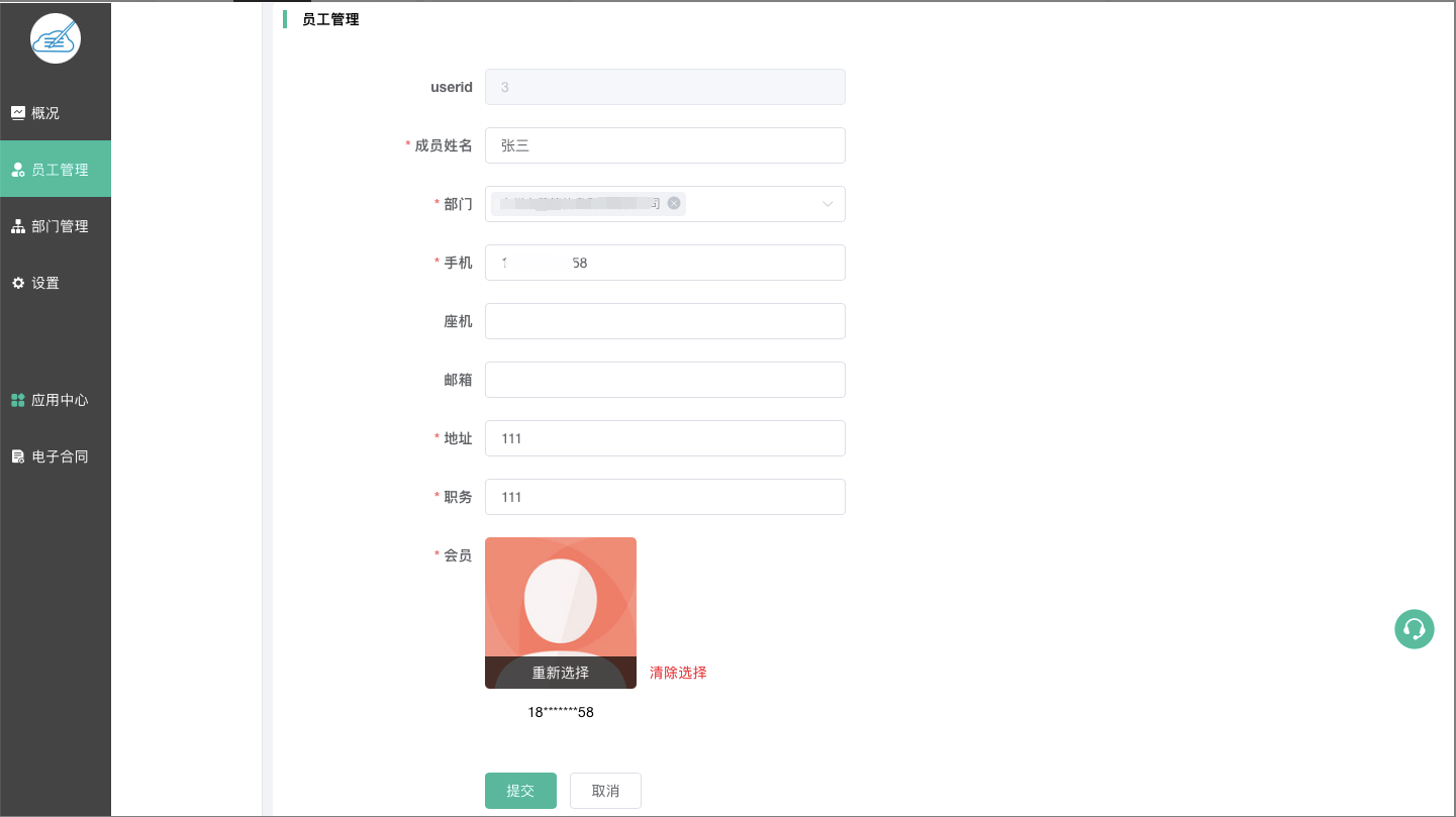 添加信息:姓名、部门、手机、地址、职务、选择会员